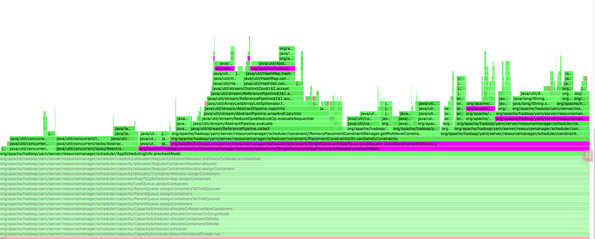 And the apps were all pending in this time. From the flamegraph and jstack, all threads were all doing the SingleConstraintAppPlacementAllocator#checkCardinalityAndPending’s PlacementConstraintsUtil.canSatisfyConstraints. Digging into this code, the recursion and string append were scattered everywhere, that made the performance regression.