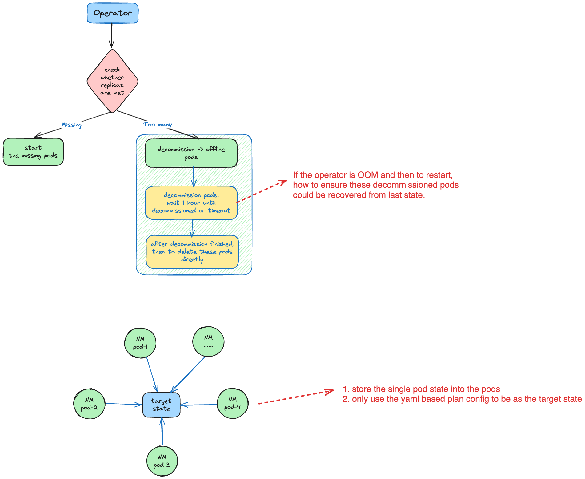 For example, the operator has started the 4 pods, currently each pod is running normally. Now, we want to decommission 1 pod, specified by the operator’s yaml, and this pod’s state will change from running to decommissioning (if the decommissioning state cannot be interrupted). And then I want to expand the pods to 5 replicas. Question: How to do this for the operator?