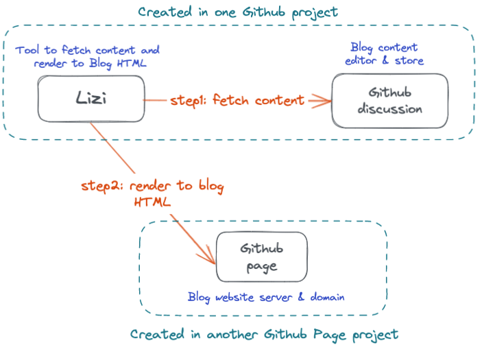 From the above pic, the simplest description for lizi is a serverless program to fetch the github discussion’s content and then render the web page from the markdown style.